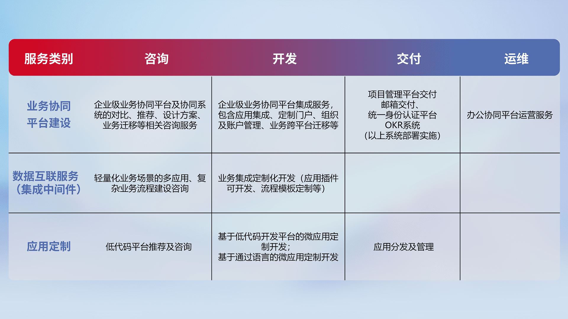 针对钉钉、、企微、、IDaas等平台级产品提供产品的规划、、、、方案、、、、交付、、定制化开发等服务,,,,实现如统一协同办公、、智能客户服务、、、混合会议管理、、、、智能数据查询、、、、等业务场景,,,实现数字化转型。。。